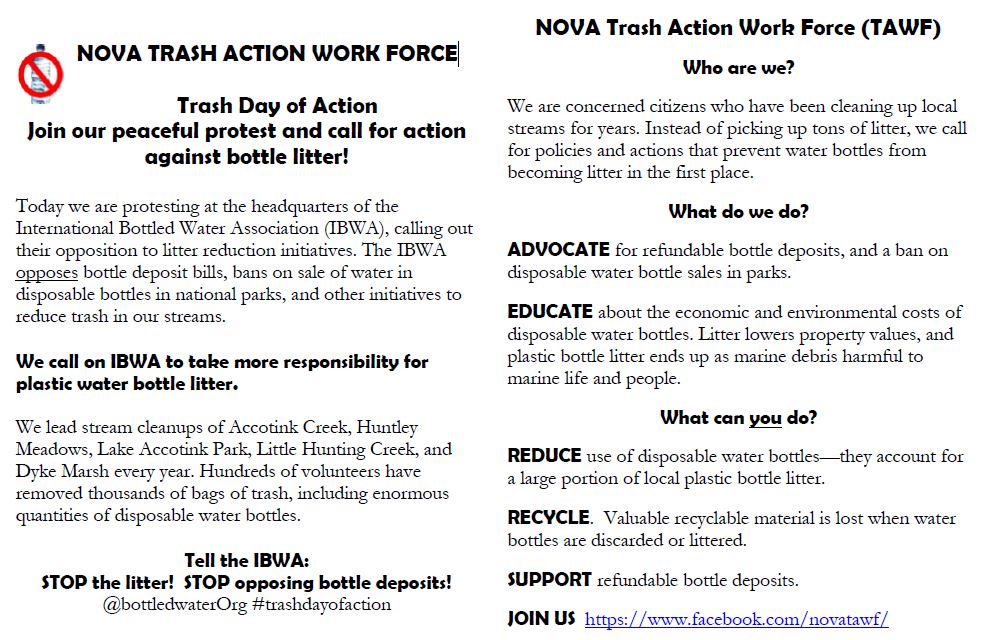 The NOVA Trash Action Work Force (TAWF)'s first Day of Action on May 8, 2017 was a success! We protested at the headquarters of the International Bottled Water Association (IBWA), calling out their opposition to litter reduction initiatives. The IBWA opposes bottle deposit bills, bans on sale of water in disposable bottles in national parks, and other initiatives to reduce trash in our streams. We had at least 30 people, and people brought a lot of creative energy and enthusiasm to the protest. The day started cold and early, but we persisted, setting up our display of bags of plastic water bottles retrieved during stream cleanups at two parking spots across from the building. We had a great mix of signs and messages, from sharpies, cardboard and glitter fish to posters by GMU student graphic designers Moriah Canon and Christian Inguillo!