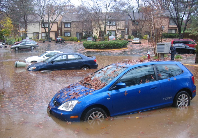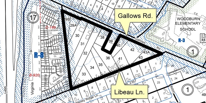 Downstream neighbors already have regular flooding issues Is this the right land use in the right place? On February 13, 2019, the Planning Commission voted unanimously to indefinitely defer action on the proposed Gallows Road Development. This may or may not be the end. The current propoasl was a revamped version of a plan that had been rejected a year before. Another may yet rise to take its place. Annandale Blog article On November 27, 2018, the Mason District Land Use committee unanimously voted to not recommend approval of the proposal to the Planning Commission. The Planning Commission hearing originally scheduled for December 6th was postponed to January 9, 2019, and then again to January 30, 2019, supposedly for non-related reasons. Friends of Accotink Creek Comments to Planning Comission Christopher Land is proposing to develop 72 independent senior living units on property located on the south side of Gallows Road, just east of I-495. Senior housing options will include single family, townhomes, and a condominium building. The application is a consolidation of 15 lots for a total acreage of 9.0299 acres, now occupied by single family dwellings, mostly constructed in the 1930's to 1950's. There is a prominent holdout property, forming a "piano key" sticking into the proposed development. Neighbors in opposition have been conducting a series of meetings with parties who might affect the outcome. The principle thrust is that this proposal is the same one that was rejected last year (on the same property, by the same developer), but now in the guise of a senior living community, which gives it some advantages and allowances. An unnamed tributary of Accotink Creek originates on the property, flowing under I-495 to join Accotink Creek north of Little River Turnpike. A narrow corridor of perhaps 10’ along this stream is protected by the Army Corps of Engineers as a palustrine wetland in the waters of the United States, even though there is no county Resource Protection Area defined here. Most of the stream is in the proposed "tree save" area, but the uppermost portion intrudes into the planned developed area and would likely be sacrificed. Planned stormwater controls include two or three raingardens, some Filterra inlets, and Jellyfish filters. There is no plan to use pervious paving, due to maintenance challenges. The main stormwater control is underground detention chambers of a capacity of 45,000 ft3 sized to control the 10-year rain event. The Raintree townhouses downhill from the area are already experiencing regular parking lot flooding. Capacity will be increased to control the 100-year event if studies show the 100-year event reaches Raintree buildings (not parking). This increased storage would (of course) increase tree loss. All this requires a Special Exception to the county's Comprehensive Plan. The Mason District Land Use Committee rejected the proposal, but its actions are non-binding. The Planning commission considers the case January 9, 2019. Public comments may be addressed to plancom@fairfaxcounty.gov, referencing SE 2018-MA-005.