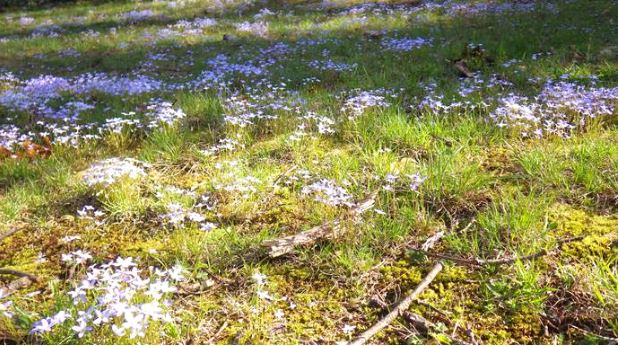 Common Bluets (Houstonia caerulea), Poverty Oatgrass (Danthonia spicata), mosses, and woodland litter and duff in open “lawn” along the Mount Ida escarpment in the City of Alexandria, VA. Photo by R.H. Simmons