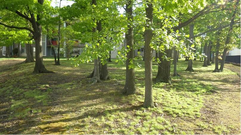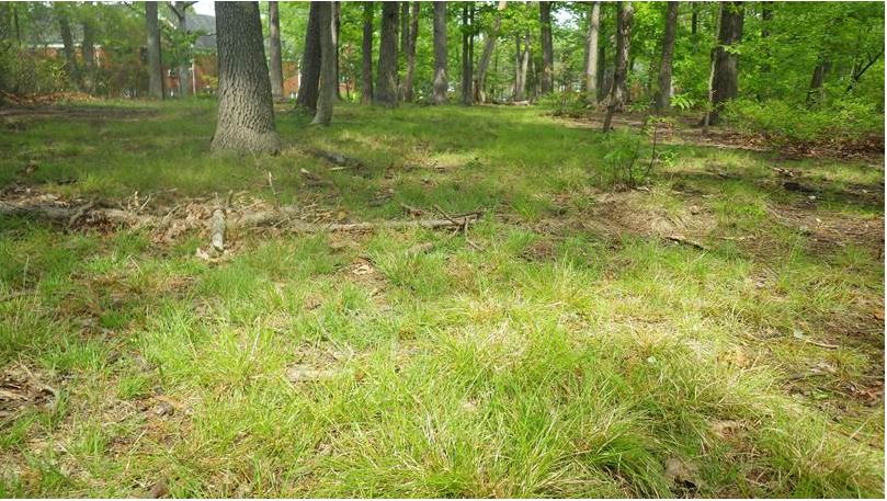 “No Mow” native lawn of Poverty Oatgrass (Danthonia spicata), Parasol Sedge (Carex umbellata), lichens, and mosses under mixed upland oaks on the flat, gravelly Dowden terrace (Fleming 2015) at Seminary Forest Apartments adjacent to the Burke Branch of the Alexandria Library, City of Alexandria, Virginia. Photo by R.H. Simmons