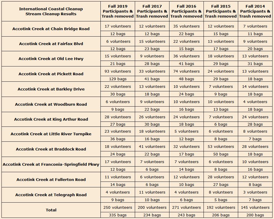 Our October 5, 2019, stream cleanups: We had a chilly, but sunny, start to the day. Temperatures rose into the mid-60's by midday as overcast and clouds took over the sky for the afternoon. Pickett Road was our first site of the day. The Faith Alliance for Climate Solutions was with us, providing most of our 48 volunteers. The members of Oakton High School Green Club also joined us, along with our returning team of indefatigable Falls Church High School students. Thank you, Faith Alliance, Falls Church H.S., and Oakton Green Club! Our volunteers collected 80 bags of trash and 3 tires. Our unique finds here included 2 lawn chairs, a child's tricycle, and a radio/TV tuner. After many weeks with hardly a trace of rain, Accotink Creek was a sad trickle. The Hatmark Branch tributary here was showing no flow at all. We found a set of car keys here and puzzled how to find the owner - a solution appeared at our next site. At Barkley Drive, our second site of the day, we had 22 volunteers. Our Falls Church H.S. team returned. Thank you, Falls Church H.S.! The volunteers removed 30 bags of trash and 1 tire. Our most unusual finds here were a plastic toy machete and a squash racquet. Volunteers used the racquet and an empty bottle for a game of "trashball." A bicyclist appeared, inquiring if we had found car keys. So we had, and reunited them with their owner. Our last site of the day, and of the season, was Woodburn Road. Here we had 6 volunteers. The Falls Church H.S. team was with us again. Thank you, Falls Church H.S.! We collected 9 bags of trash and 3 tires. Our most unique find was some bits of unidentifiable metal framing. Here we were at the other end of the trail paving project we had encountered last week at King Arthur Road. We were disappointed with the careless way large piles of soil were left unsecured on the streambank, ready to run into Accotink Creek at the first rain. We spent considerable effort removing debris from the construction from the creek - a metal concrete form, an orange safety barrel, and many yards of silt fence that was supposed to be protecting the creek, but instead was polluting it forever. We were forced to leave behind even more silt fence too tightly entangled in tree roots in deep water. "Consider the cost to engineer a water amenity like Accotink Creek compared to the cost of preserving what nature has blessed us with." - Donald Pless Remember to remind your groups of the importance of proper cleanup during and after all outdoor activities. Reduce, Recycle, Reuse! In all things of nature there is something of the marvelous. - Aristotle |