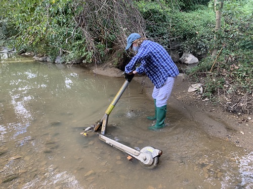 Hauling an electric rental scooter out of Accotink Creek at Old Lee Hwy |
