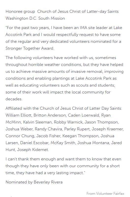 This group has been amazing, just working so hard at the Invasive Management site at Lake Accotink Park every Saturday. In the photo, they are actually holding up an invasive porcelain berry root that's over fifteen feet long that they dug up. They have done so much work for us over the past, probably ten months; and they have enabled us to achieve so much and I just wanted them to have some recognition of what they have accomplished and how they have helped us; I nominated them for this very well deserved award, part of the Volunteer Fairfax 2020 Volunteer Service Awards.
