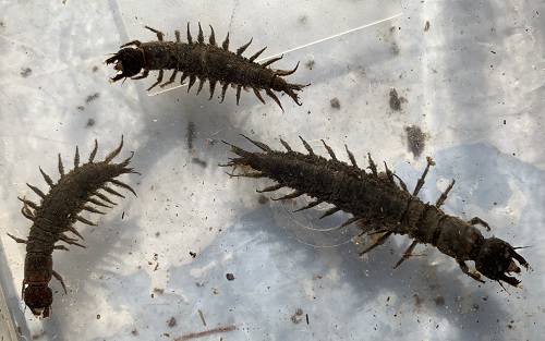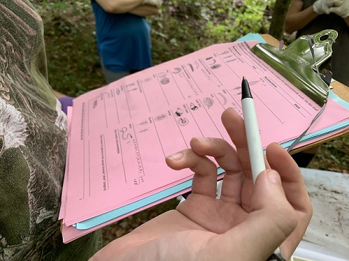 June 12, 2021 Stream Monitoring: Two days of rain left Accotink Creek running high and muddy. The water level was just low enough, though, to permit us to proceed with monitoring. The day began rather cool and overcast, but later the sun came out and the periodical cicadas began to sing. We were using our new 500 micron nets today. This required some adjustment to the handing differences from our previous coarser nets. A startling and inspiring sight today was a mature bald eagle passing us by as it flew low along the creek. Sadly, no one had a camera at the ready. The species we caught today were overwhelmingly dominated by aquatic worms, the species more tolerant than any other of impaired water. We did catch one solitary mayfly, one of the less tolerant species.