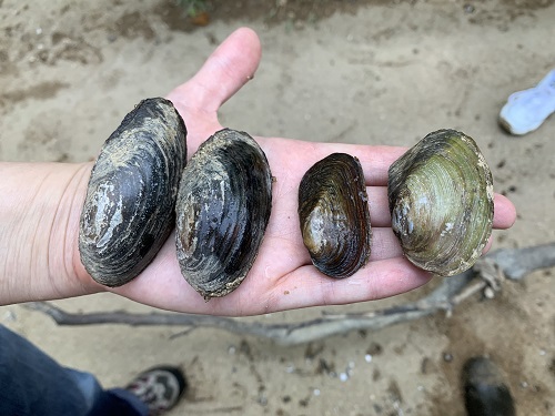 September 19, 2021 Mussel Rescue: In the early hours of September 17th the USGS stream gauge on Accotink Creek in Wakefield Park topped out at just over 2000 cubic feet per second, just over the threshold at which freshwater mussels will be pushed out of the streambed and stranded on the gravel bars. A group of four volunteer rescuers assembled by the dam and spent about three hours searching the gravel bars after the creek returned to its usual level. Along the way we found time to forage for ripe Pawpaw fruits, berries of the invasive Autumn Olive, and one single nut of the native American Beech tree. The one-mile stretch downstream from the dam is the only part of Accotink Creek in which mussels are able to survive at all, the high volume of shifting sediment having gradually smothered the populations elsewhere. We located twentytwo mussels and returned them to safety in the deeper parts of the creek. This is not a large number, but each female mussel has the potential to produce hundreds or thousands of progeny over time. We located all of the three mussel species found in Accotink Creek, the Eastern Elliptio (Elliptio complanata), Paper Pondshell (Utterbackia imbecillus, and Eastern Floater (Pygandon cataracta). One mussel was different-looking, of a species that was hard to identify, probably a different-looking Eastern Floater. See the rest of the mussel rescue photos here. Read about our 2015 freshwater mussel biological survey. Learn more about freshwater mussels.