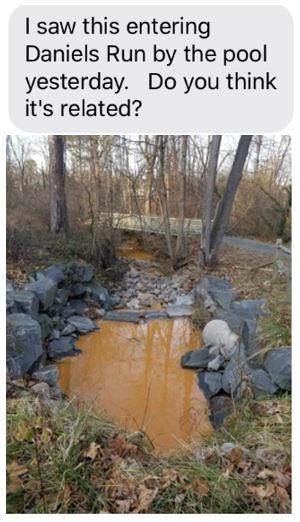 Here we go again! Same stream, different broken water main, same results - sediment-filled water, adding further impairment to a stream that is already struggling to support life. These breaks happen on a daily basis, according to the Fairfax Water Leaks & Breaks webpage. The cumulative effect on the health of our streams cannot be negligible.