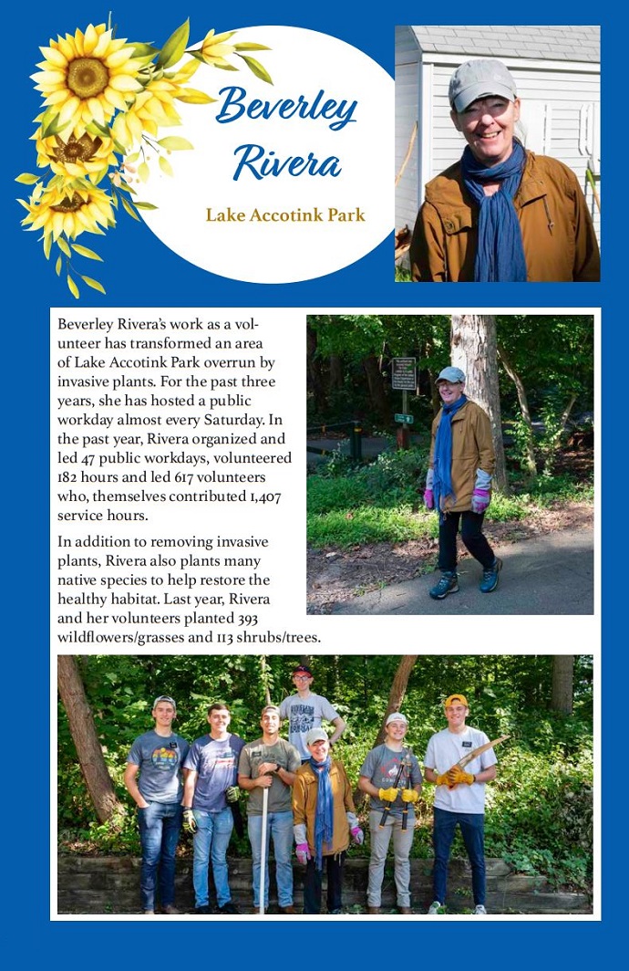 Longtime Friends of Accotink Creek volunteer and board member Beverley Rivera was a recipient of the Park Authority Elly Doyle Outstanding Volunteer Award for her admirable progress in invasive plant control at Lake Accotink Park.