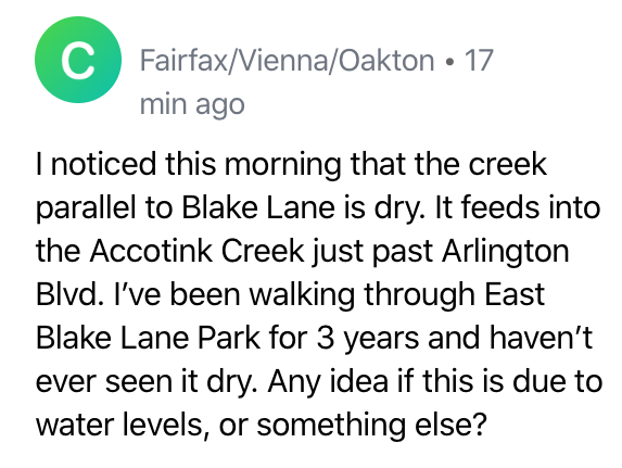 A citizen query on NextDoor alerted us that the Accotink Creek tributary of Hatmark Branch had gone dry in East Blake Lane Park in the area adjacent to the Providence Community Center. Observations confirmed there was very feeble and spotty flow upstream of this area and a steady, but tiny, trickle farther downstream. A number of deeper pools still provide refugia for numerous fish. This is a perennial stream with a Resource Protection Area. The weather had been dry, but did not seem dry enough to cause the stream to go dry. We speculated there could be changes in hydrology caused by the I-66 project or other factors, but had nothing to confirm this. Fairfax County Stormwater Planning Division made additional observations and provided the report below. Hatmark Branch is the same tributary threatened by the Pickett Road Connector Trail