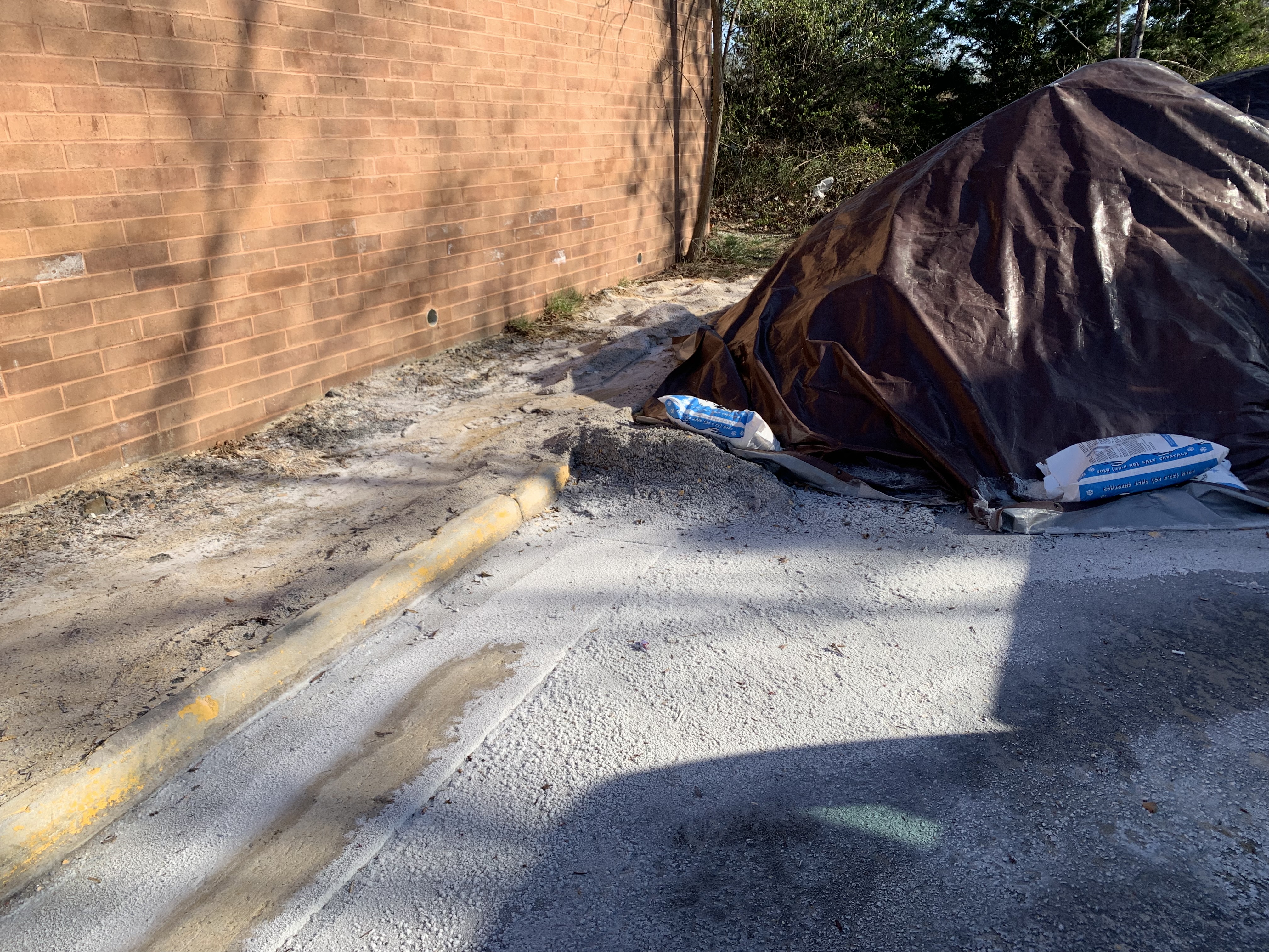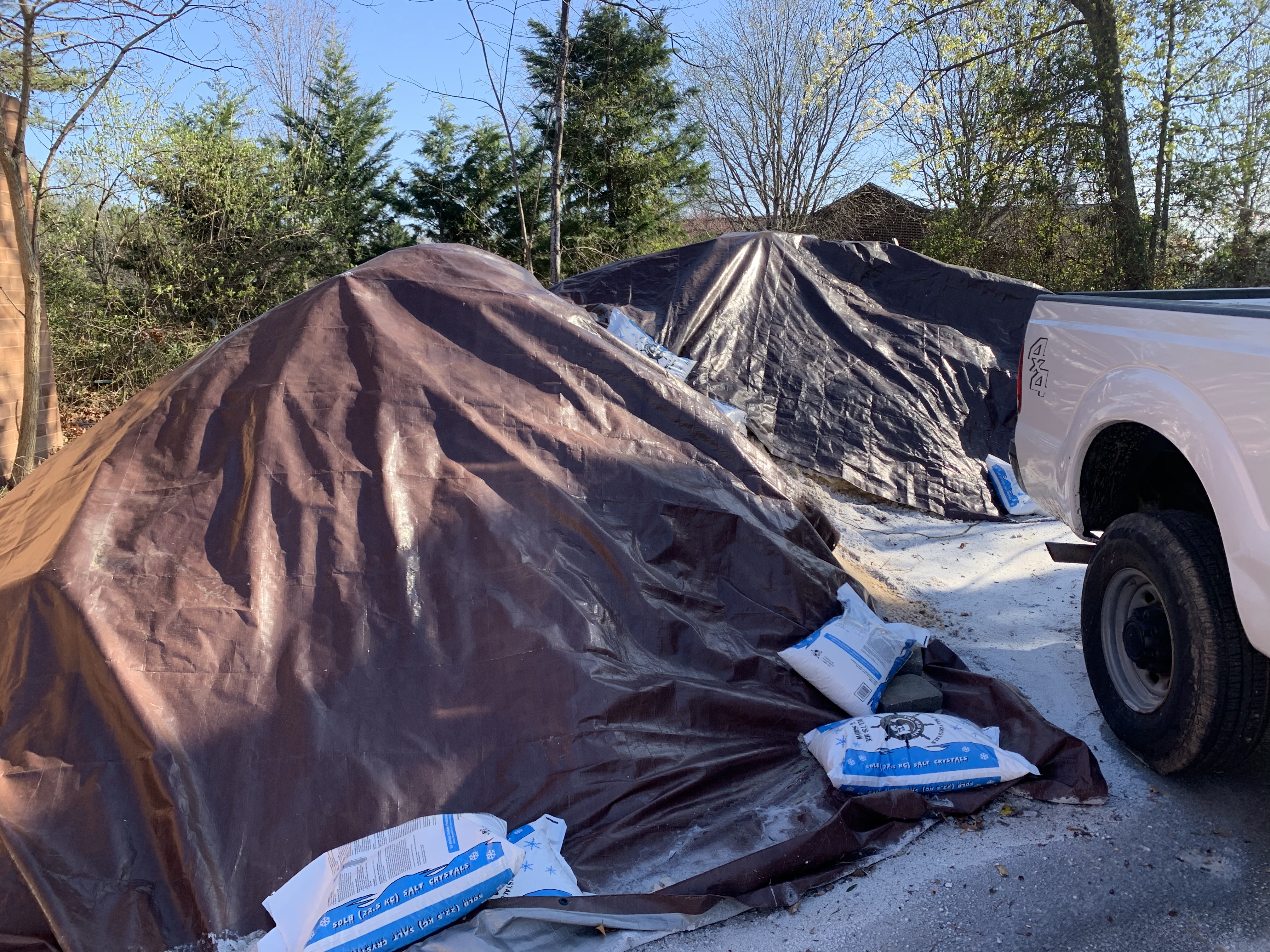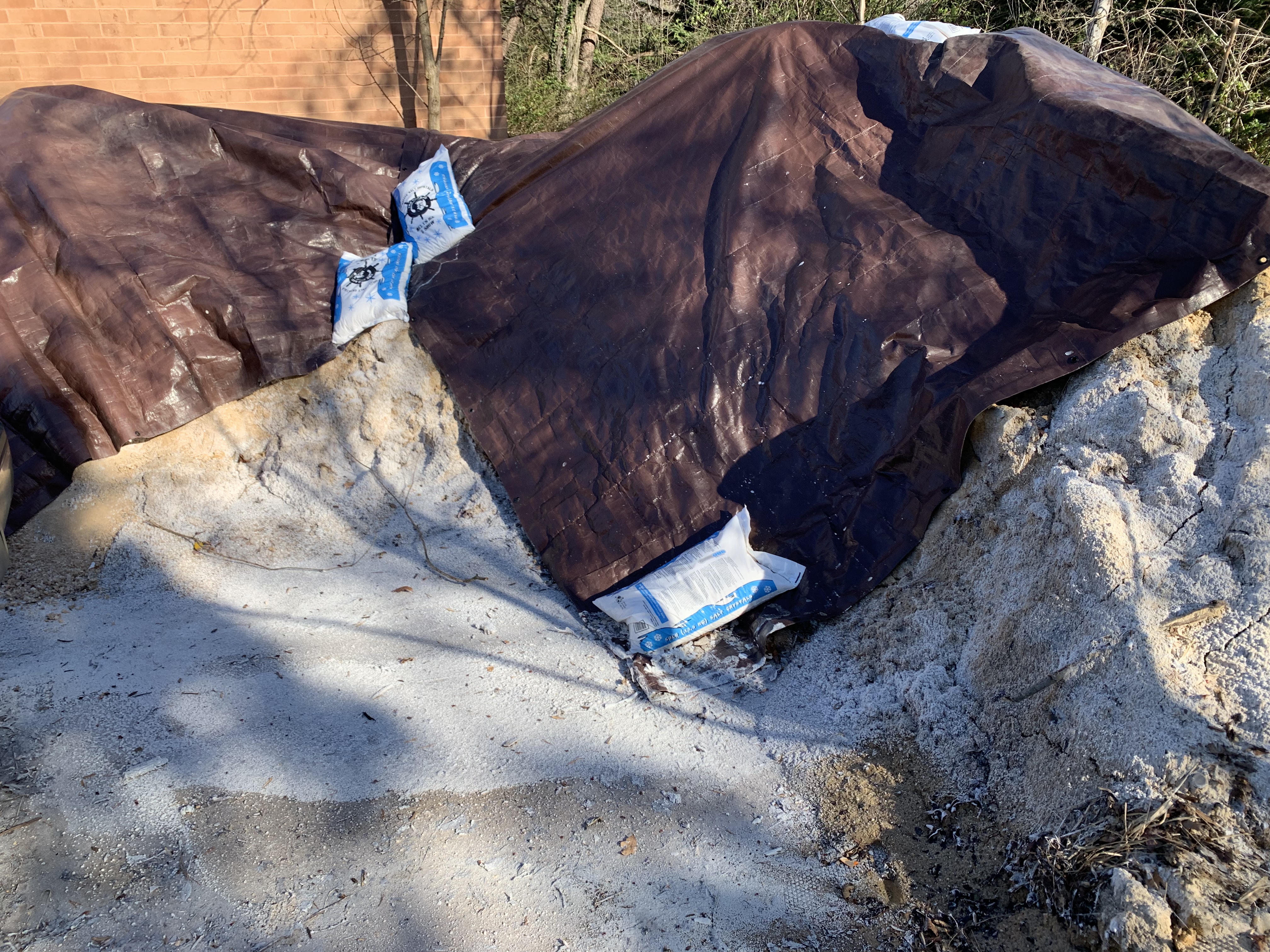 Salt-sand mixture is only partially covered and exposed to precipitation.