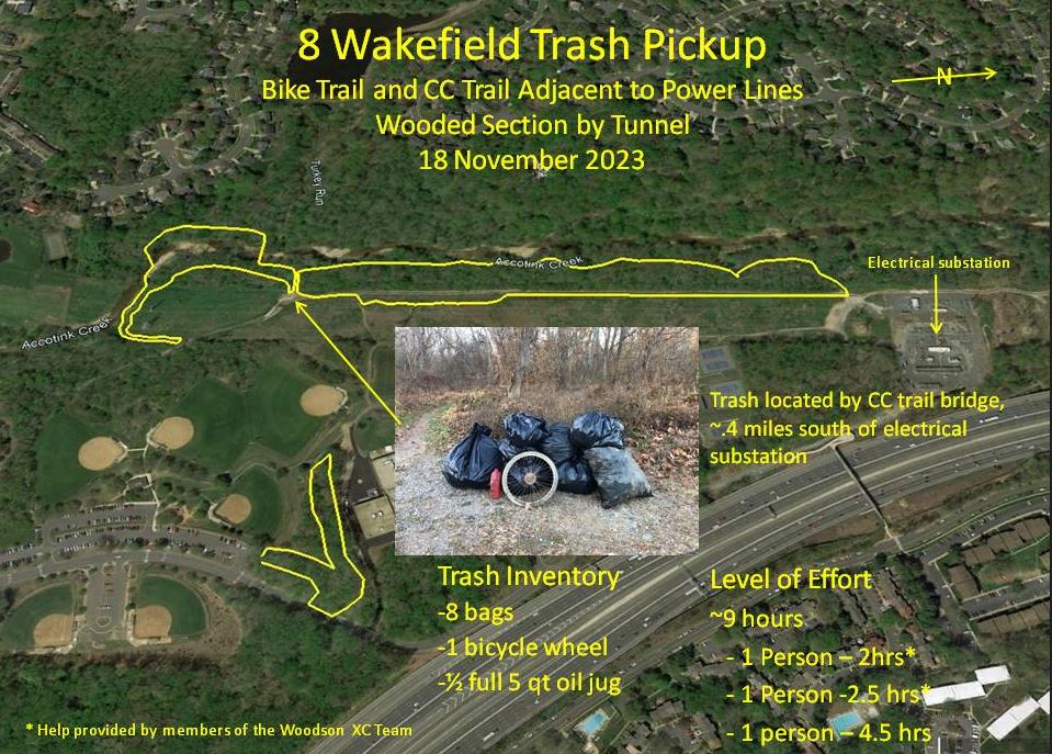 Solo wintertime cleanup: We want to recognize the impressive efforts of Ted Plunkett, who conducted his usual solo winter cleanup campaign in the Wakefield Park area. Ted has done cleanups like this for years in and around Wakefield Park, and he's earned our gratitude and admiration. Thanks, Ted! |