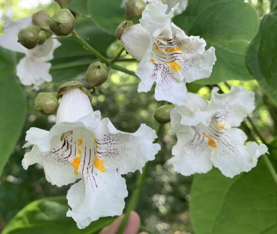 A splendid day for stream cleanups. Temperatures hovered in the mid 80's, with sunny skies all day long. At our first site, Fairfax Boulevard, on this start of Memorial Day weekend, the motorcycles kept rolling by our meeting point, preparing for the annual Rolling to Remember event at the nearby Harley Davidson dealer. We had a crew of 18 volunteers here, including a group from Highlight Technologies. Thank you, Highlight Technologies! The volunteers collected 25 bags of trash. Our most unique finds here were a bicycle frame and an office chair base. At our second location, Chain Bridge Road, mulberry trees were in fruit along the trails, offering volunteers the chance for refreshing snacks. We had 9 volunteers, who removed 13 bags of trash. Our most unusual finds here included a storm drain protector sock that evidently went down the drain it was supposed to protect, just the same as the one found here last year. Other unusual finds were a child's scooter, a garden gate, and an intact full length mirror. We also found a wallet which was turned over to the police. Blenheim Blvd, our last location of the day, saw a turnout of 17 volunteers who collected 12 bags of trash. Our most unusual finds here were a bicycle pump and a hunk of metal that had once perhaps been a starter motor, but was now difficult to identify in its corroded state. A catalpa tree was in bloom next to our meeting point, offering us a show of its dramatic blossoms. |