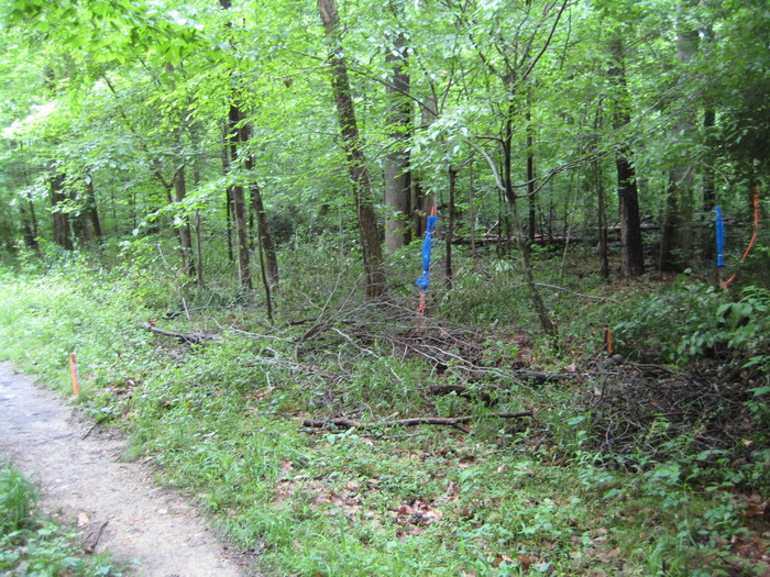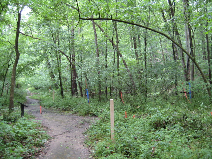 May, 2008: Confusing, too many stakes at Lake Accotink Park office spur trail