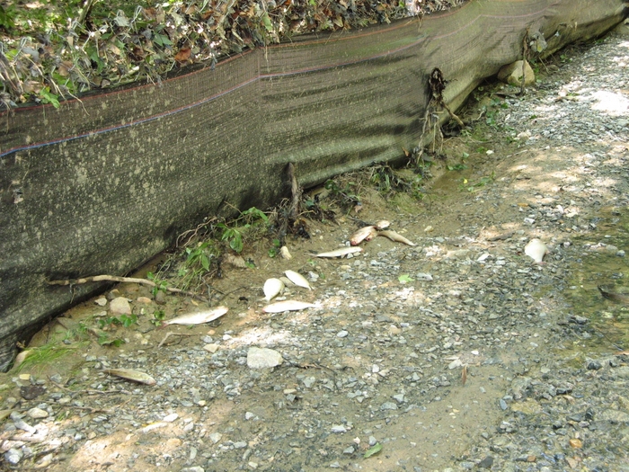 On September 7, I went back and photographed the damage. Downed trees were all along the creek and some along the trail. Most of the new culverts suffered serious damage. The silt fencing and the orange net fencing were severely damaged. Some of this washed away and became deadly debris downstream. The most shocking of all sights was that hundreds of fish were dead on the trail and dozens or hundreds more were trapped in puddles and blocked culverts or were caught in the temporary fencing. I couldn't walk down the trail without watching where I stepped so that I did not step on a fish! This was over a section a mile long. I did not walk the other mile, which I hear was worse. The fish were trapped because of the fencing and raised grading of the trail.