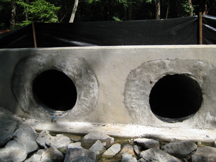 The permanent culverts being installed on year-round tributaries seem to give only lip service to fish passage. There are drop-offs on the downstream sides that seem insurmountable for the small fish present in these tributaries. If fish do manage to leap over, they will face a lenghty swim without resting points through the shallow flows inside corrugated steel pipes. Although the Park Authority maintains that sedimentation will soon render these culverts indistinguishable from the rest of the streambed, we remain dubious.