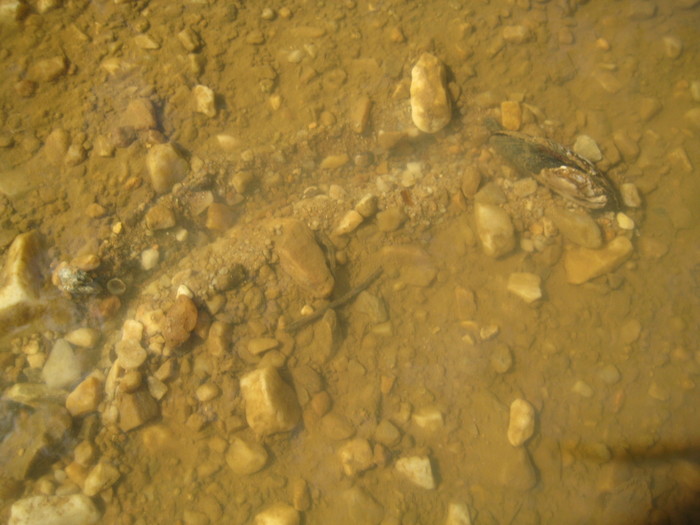 I also found about ten mussels stranded on the beach where we do our stream monitoring. They were tightly closed, so must have still been alive. I returned them to the water. One mussel was smaller and appears to have been a different species, perhaps Pyganodon grandis, instead of the usual Eliptio complanata.
