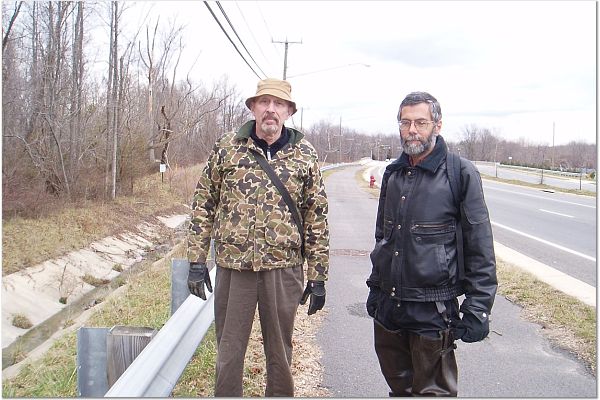 Clair Garman, webmaster, and Philip Latasa, Friends of Accotink Creek volunteer, standing near concrete storm ditch at the beginning our 5 Feb 2006 Accotink Creek hike on West side of Telegraph Road, just west of Ft. Belvoir, Davison Field.