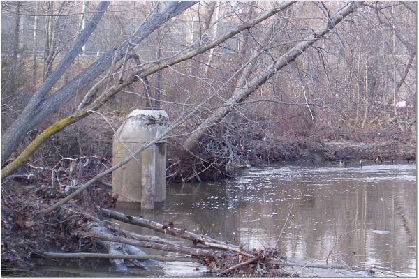 What is it, a Storm Drain or a Sanitary Sewer that is now in the stream due to bank erosion between RR and I-95? Note tree in foreground has fallen and two other trees are in main flow and about to fall. The top appears to be recently repaired. Is that a vent pipe into which high water can flow?