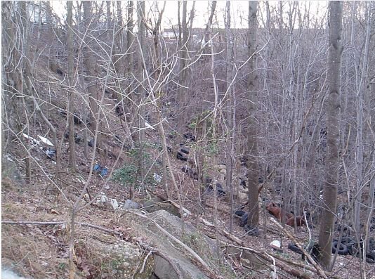 Could this be an illegal dump where we saw an estimated 500 tires,at least one battery and other trash in a ravine where a storm drain outfall drains into Accotink Creek? This steep ravine near an industrial park on the west side of Accotink Creek, north of Fullerton Road, can become a mosquito breeding grounds when the weather warms.
