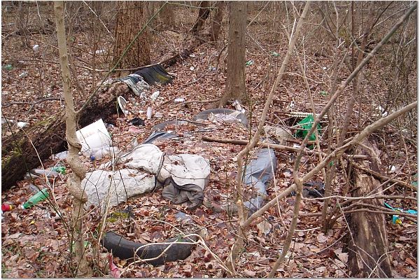 A closer view of trash on the flood plain just west of Telegraph Road and north of an industrial park.
