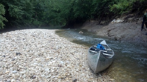 The float trip down this stretch of the creek begins with the thrill of negotiating the man-made Class II ledge at the bridge. This series of boulder barriers across the creek was likely intended to direct the current toward the center of the channel, away from the bridge supports. While there are satisfying stretches of water deep enough for paddling, very often we were portaging over shallow Class 1 riffles too numerous to count. Squeezing through narrow channels between, over, and under numerous fallen logs (a result of excess runoff from paved surfaces) was also a frequent necessity.